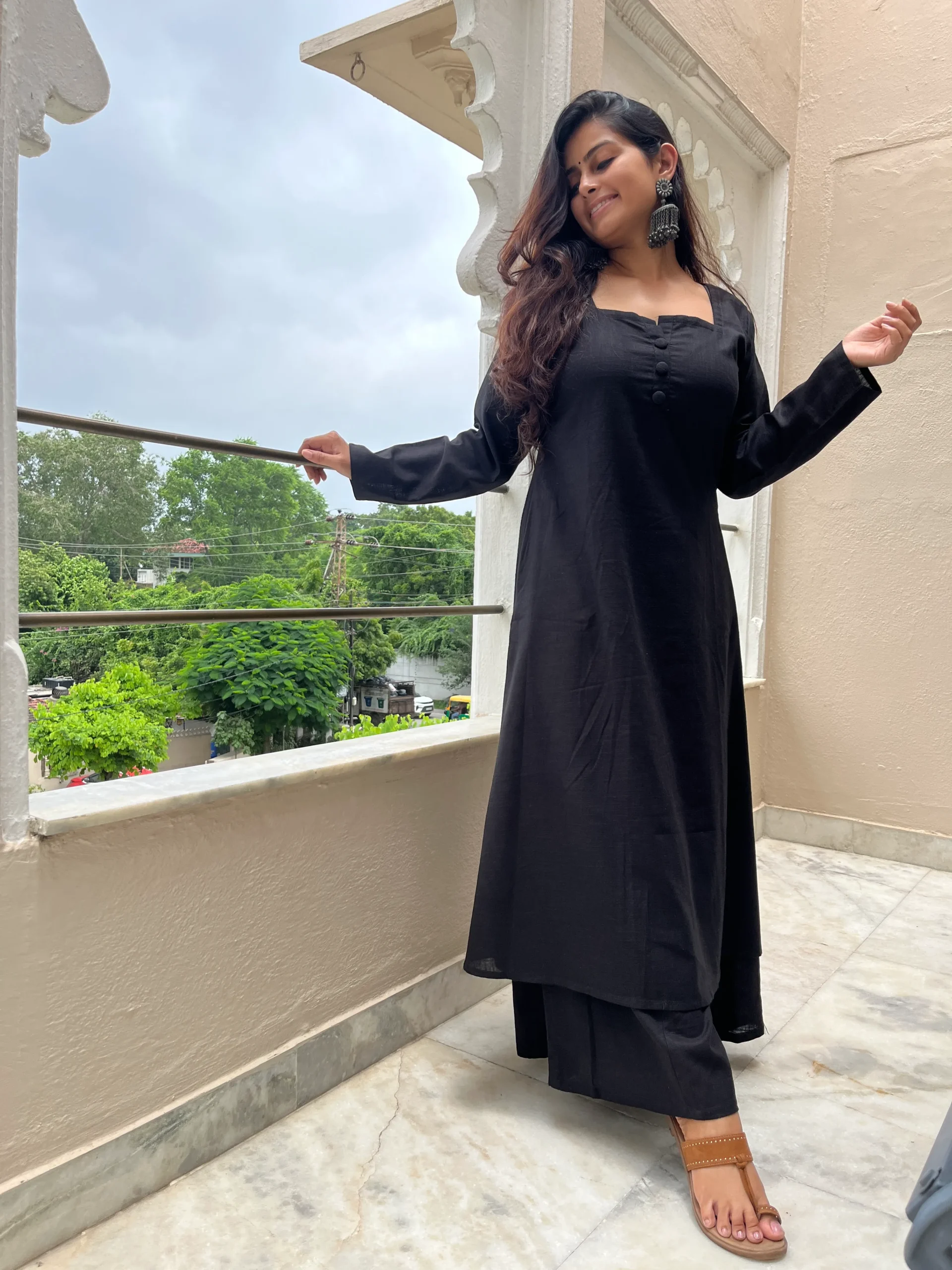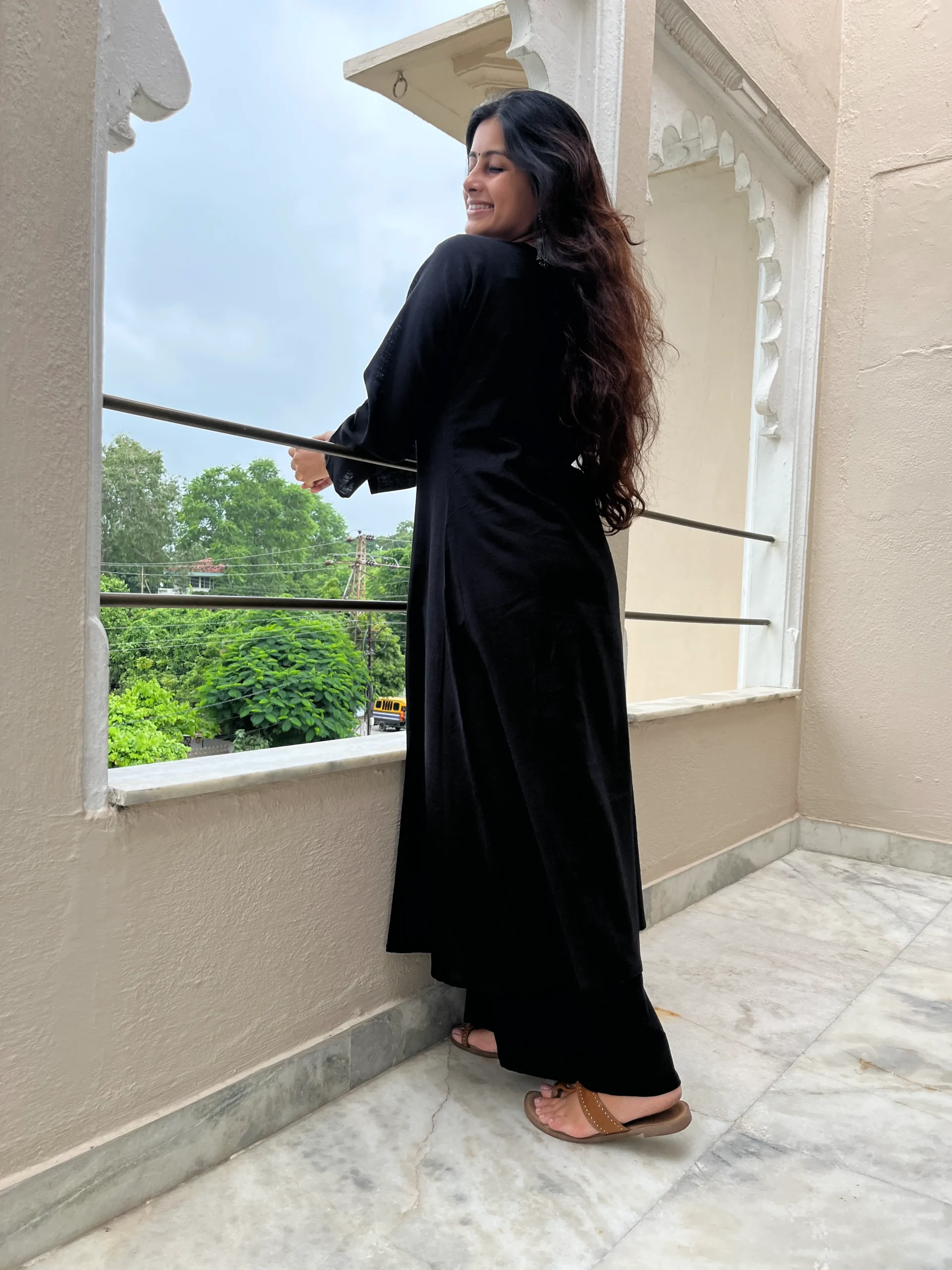 Quality fabric meets classy design – Black a line Kurta and Palazzo Pant set featuring a square neckline and wide legged palazzos.