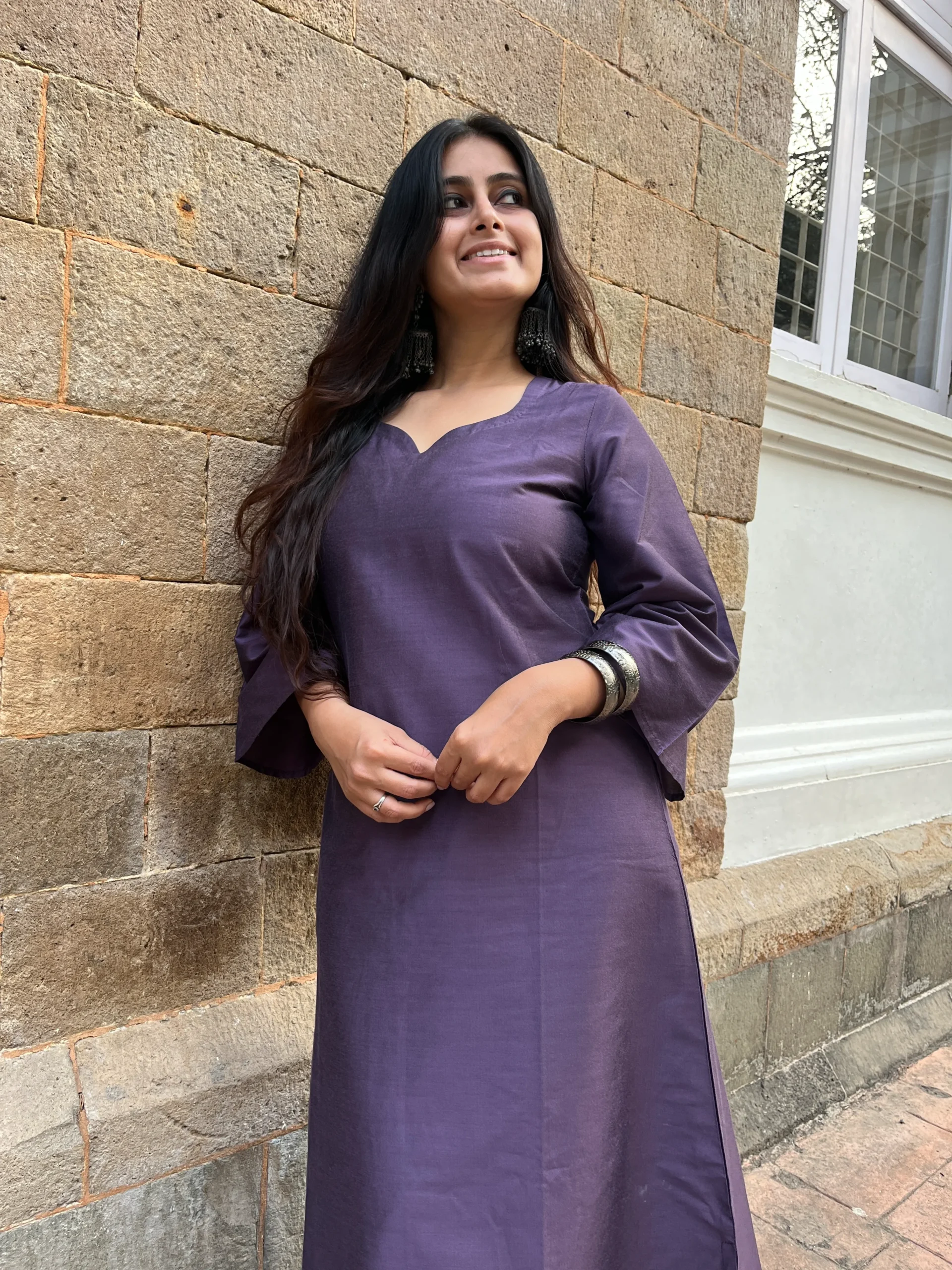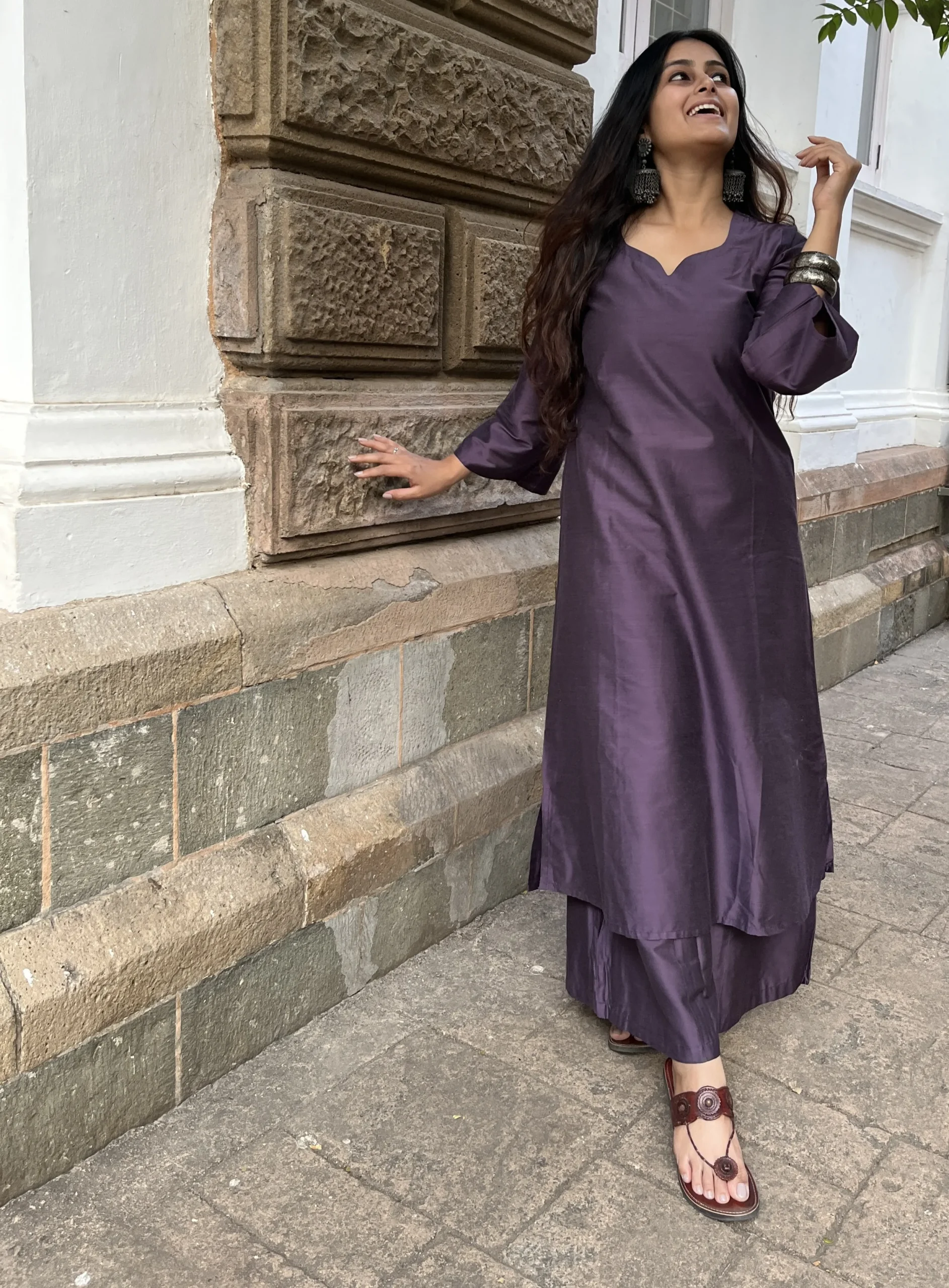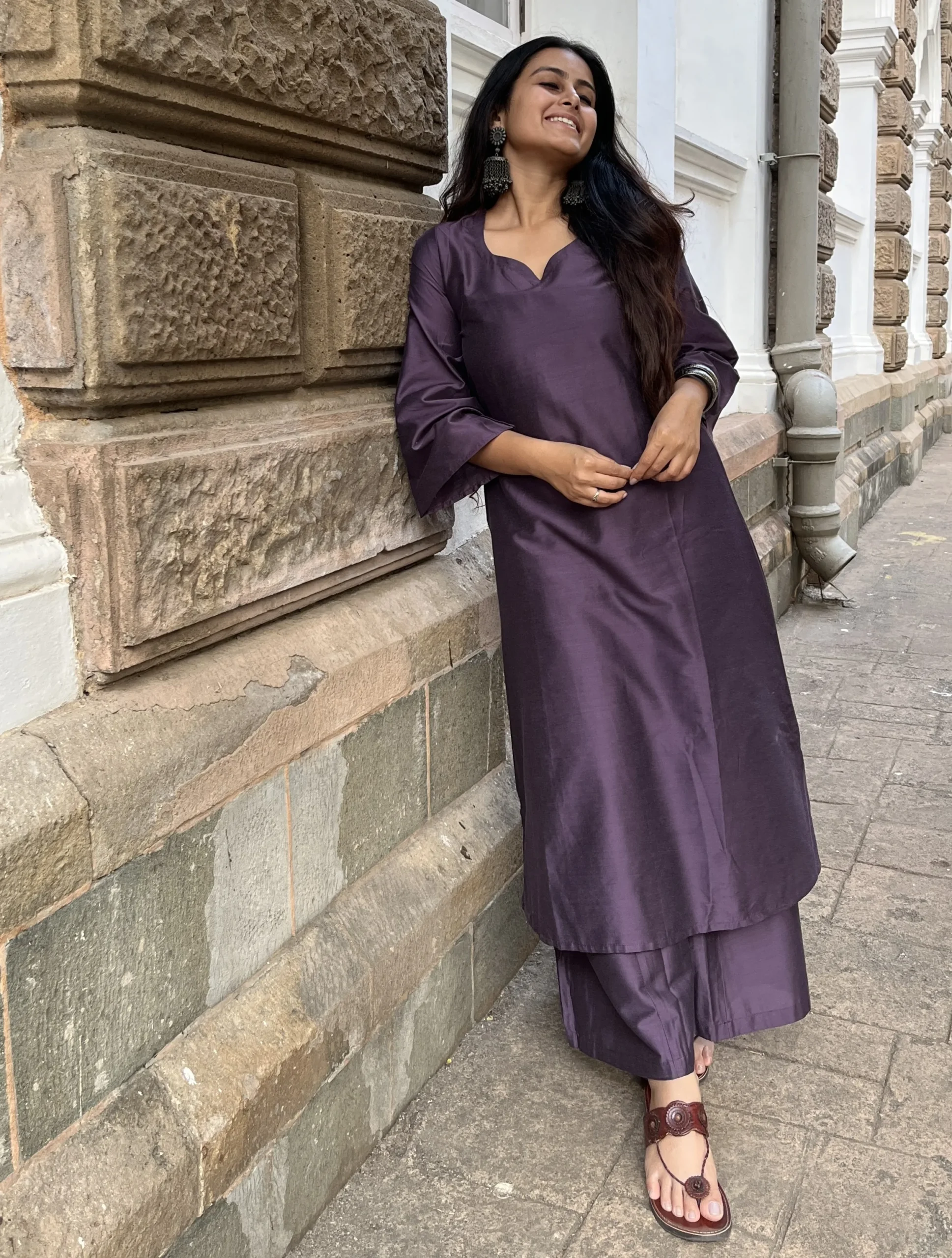 The Kurta designed in a murrya silk fabric with a sharp betel leaf neck and a 3/4th bell sleeve, paired with matching palazzo pants makes it a go to in your ethnic collection!